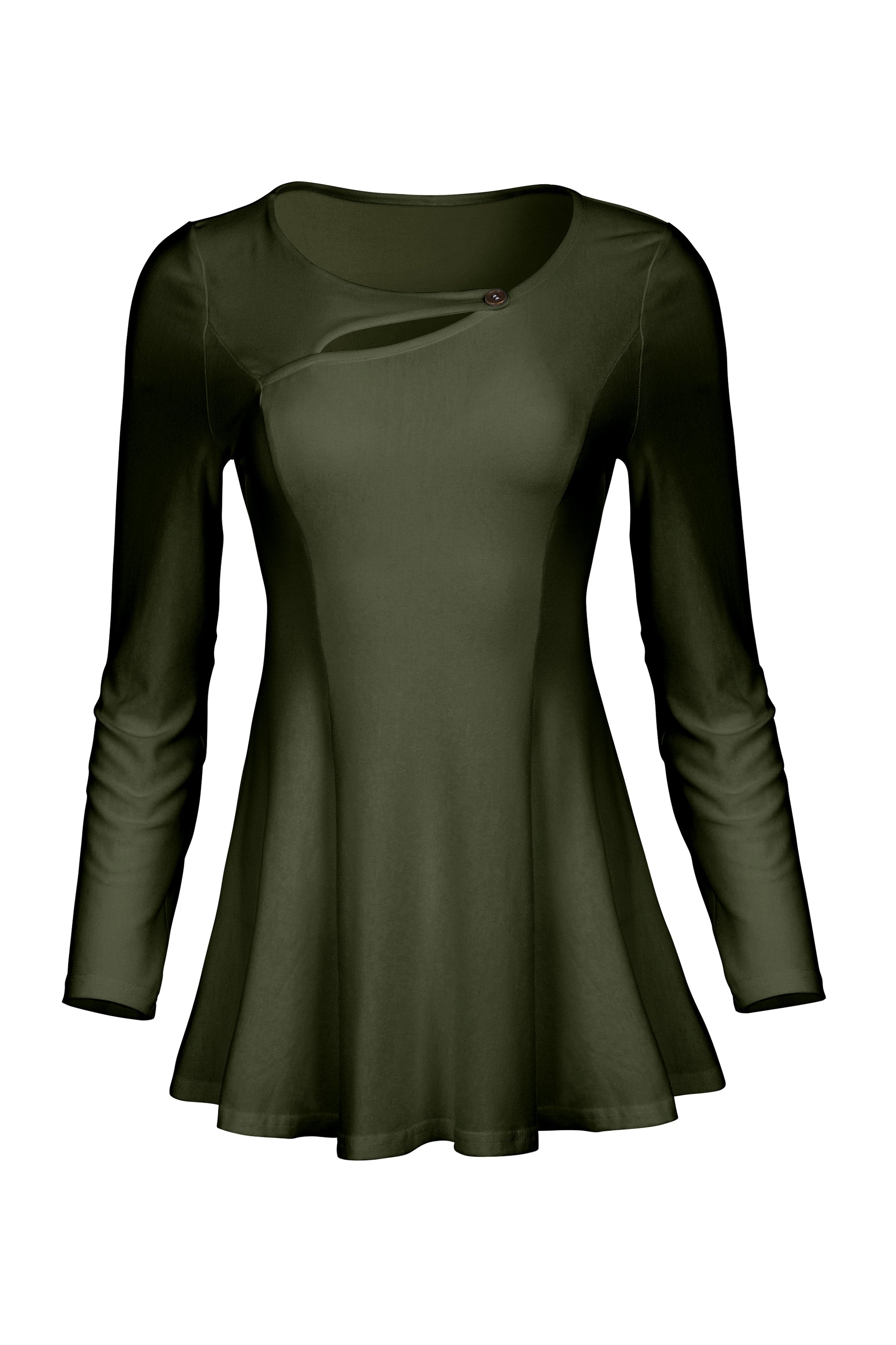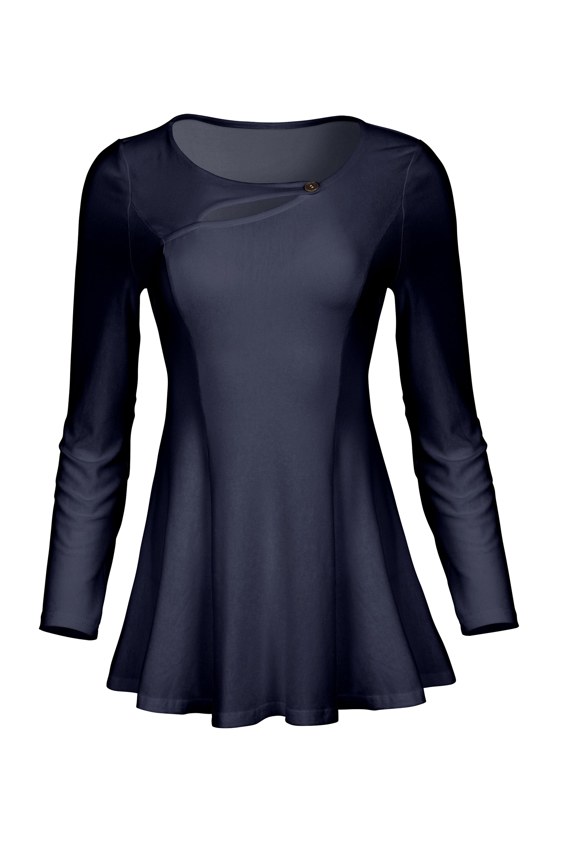 This eye-catching tunic features a unique 3-piece patched front design, combining solid colors with bold prints for a stylish contrast. Made from a soft and stretchy knit blend of 95% polyester and 5% spandex, it offers a smooth, sleek look that flatters the figure. Perfect for pairing with jeans or leggings for an effortlessly chic outfit.