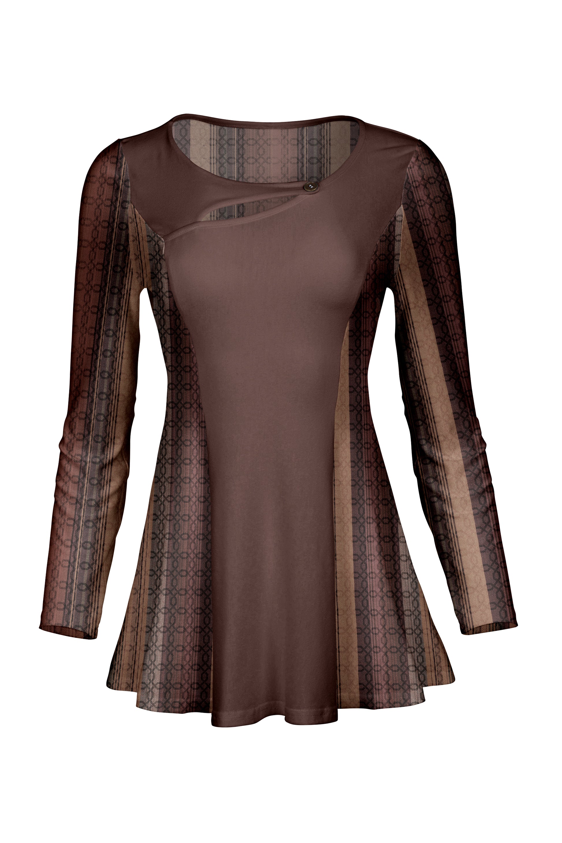 This eye-catching tunic features a unique 3-piece patched front design, combining solid colors with bold prints for a stylish contrast. Made from a soft and stretchy knit blend of 95% polyester and 5% spandex, it offers a smooth, sleek look that flatters the figure. Perfect for pairing with jeans or leggings for an effortlessly chic outfit.
