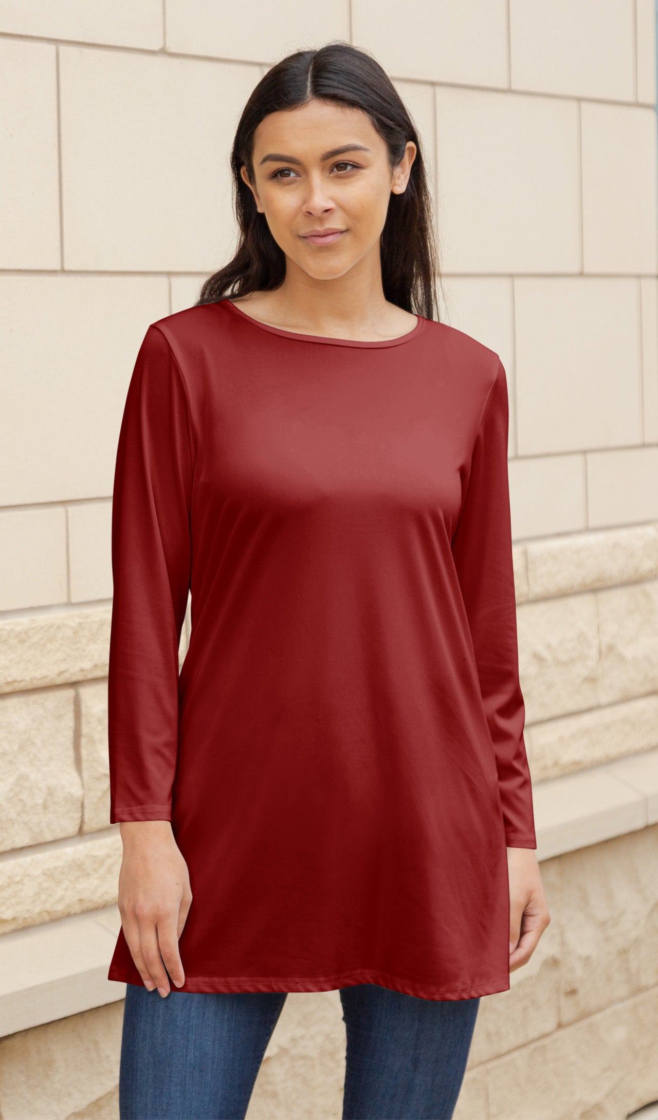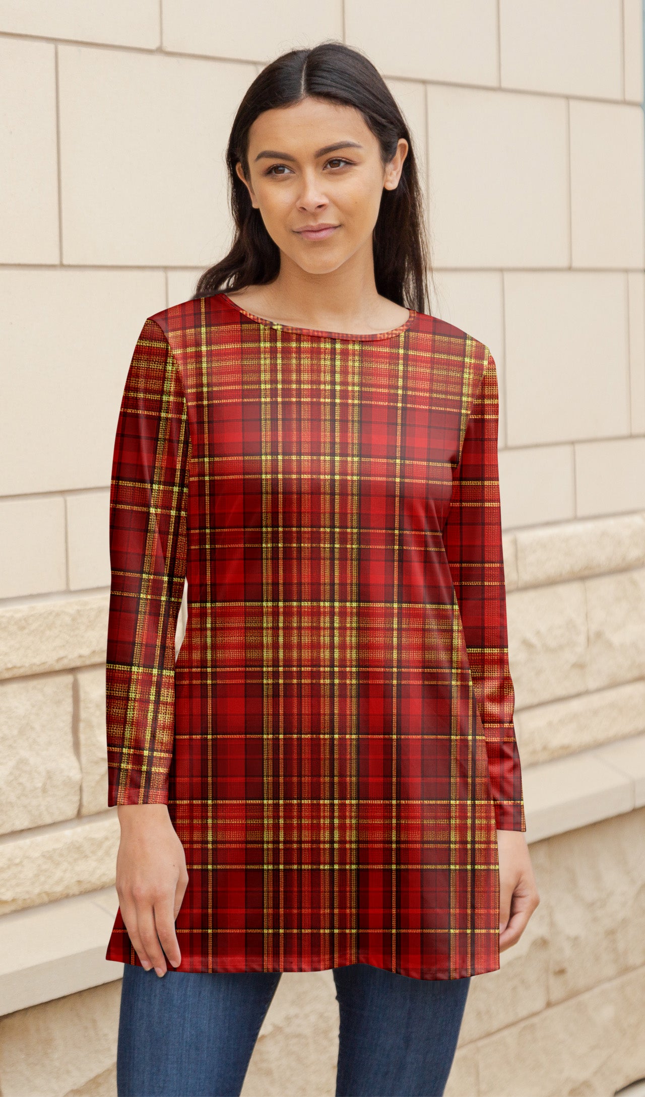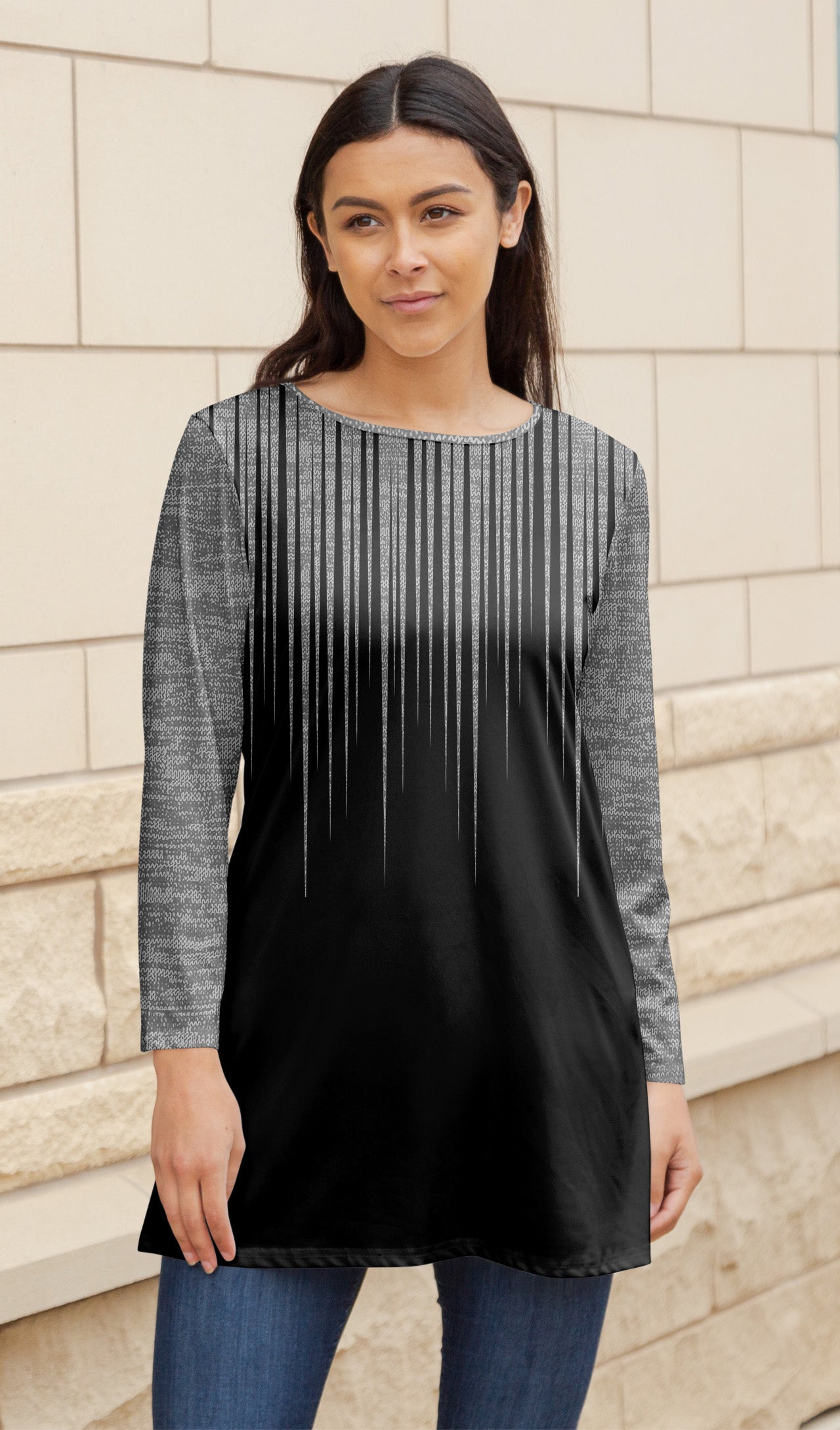 Add a vibrant touch to your wardrobe with this flowy tunic featuring eye-catching bold prints. Made from a soft and stretchy knit blend of 95% polyester and 5% spandex, it offers a comfortable fit that moves with you. Perfect to pair with leggings for an effortless, stylish look.