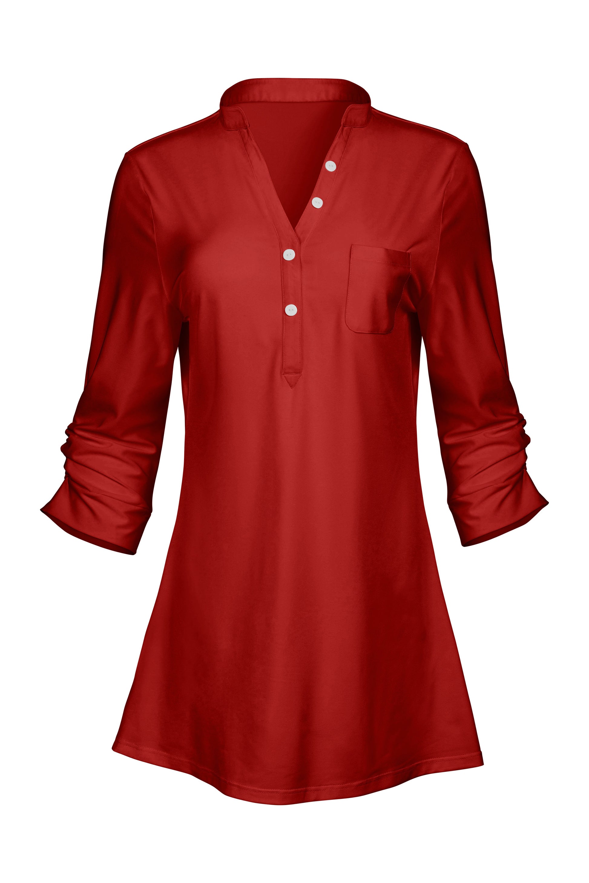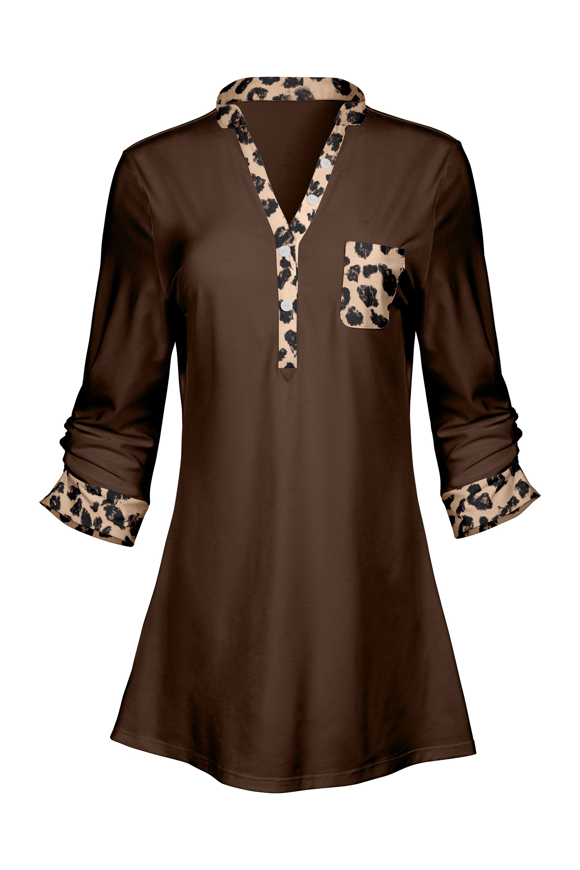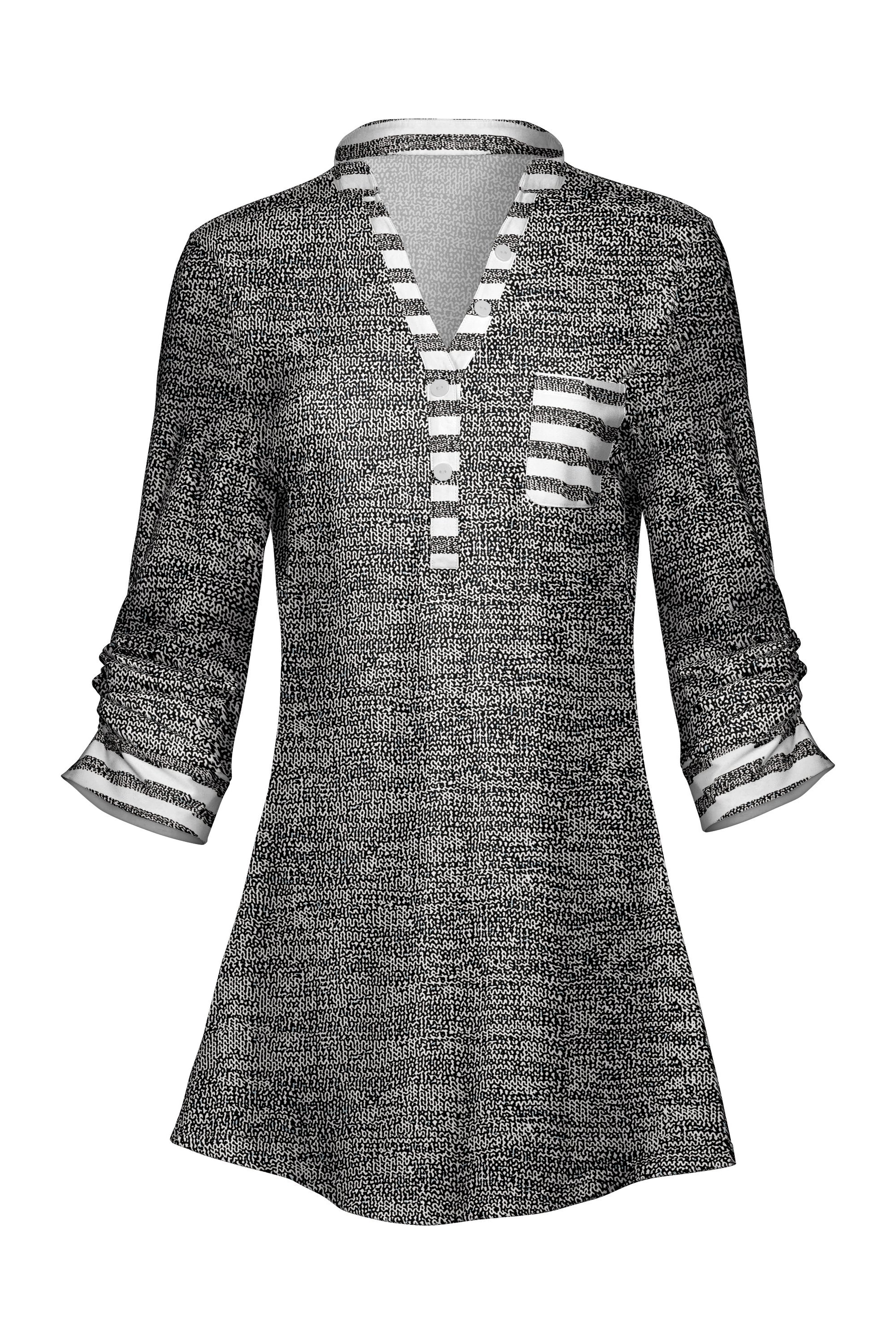 This classic tunic blends timeless shirt styling with a modern twist. Featuring a V-collar with button detailing and a unique mix of solid colors patched with prints, it offers a professional yet stylish look. Crafted from a soft, stretchy knit of 95% polyester and 5% spandex, this tunic is perfect for comfortable all-day wear at work or beyond.