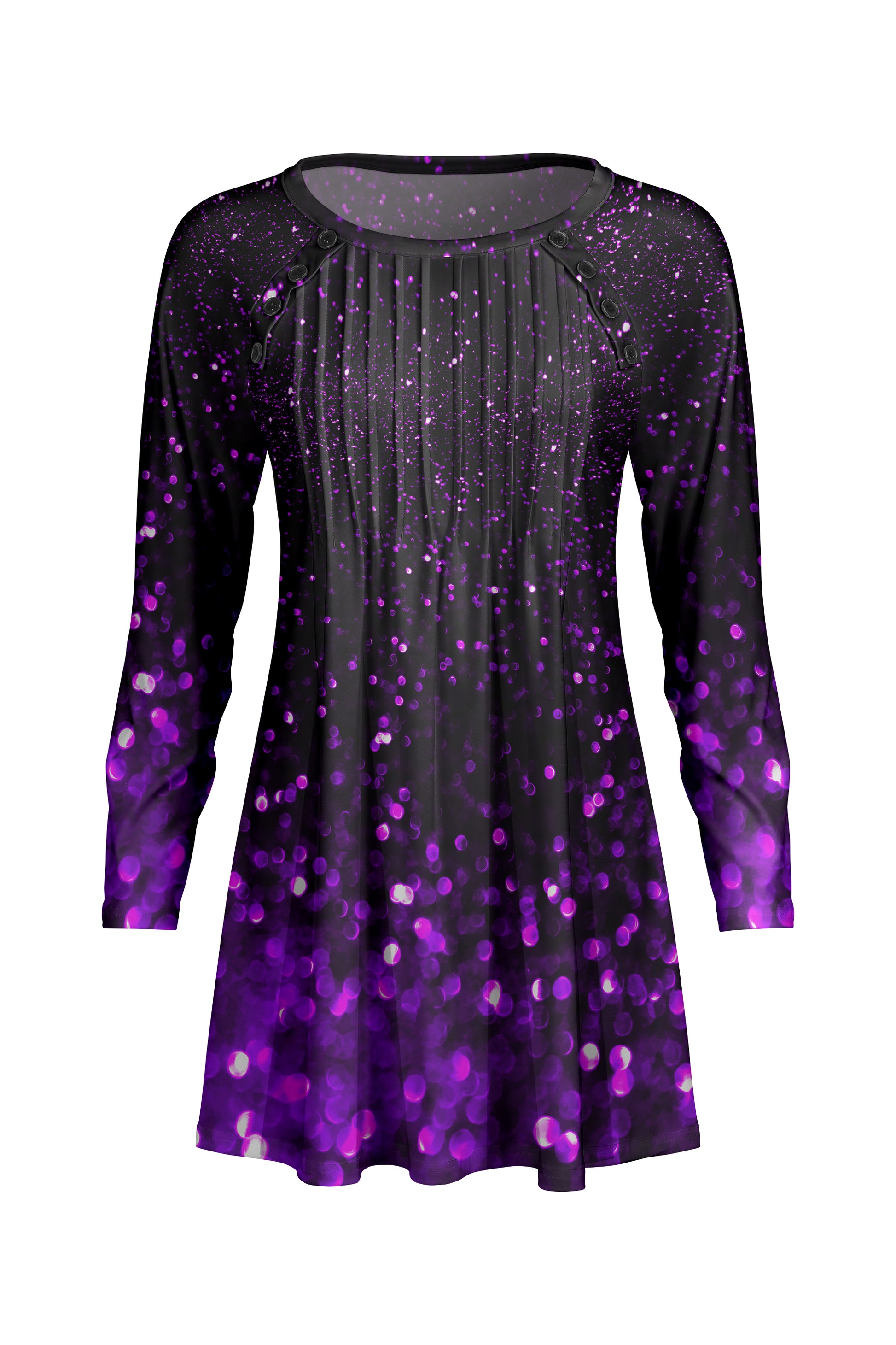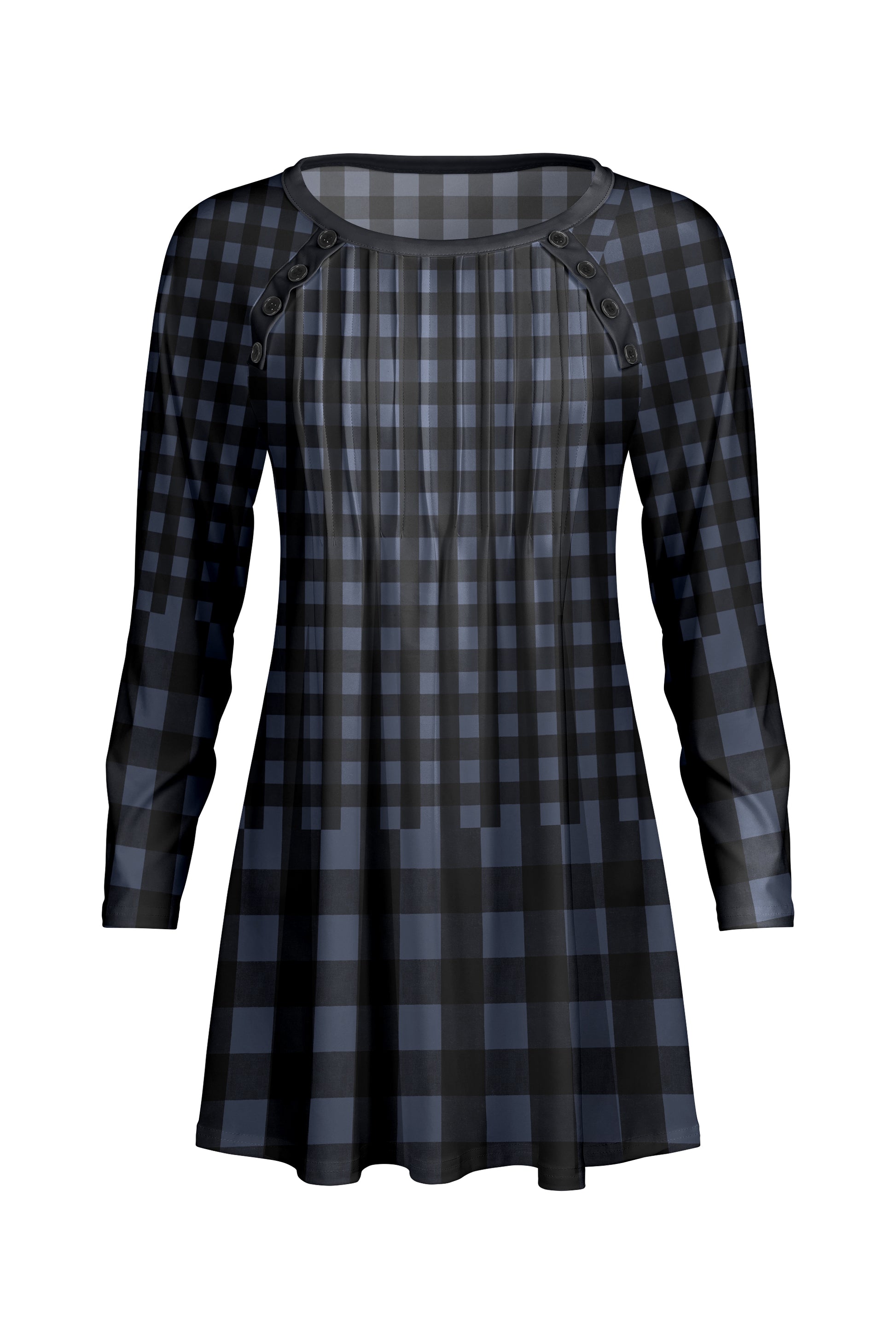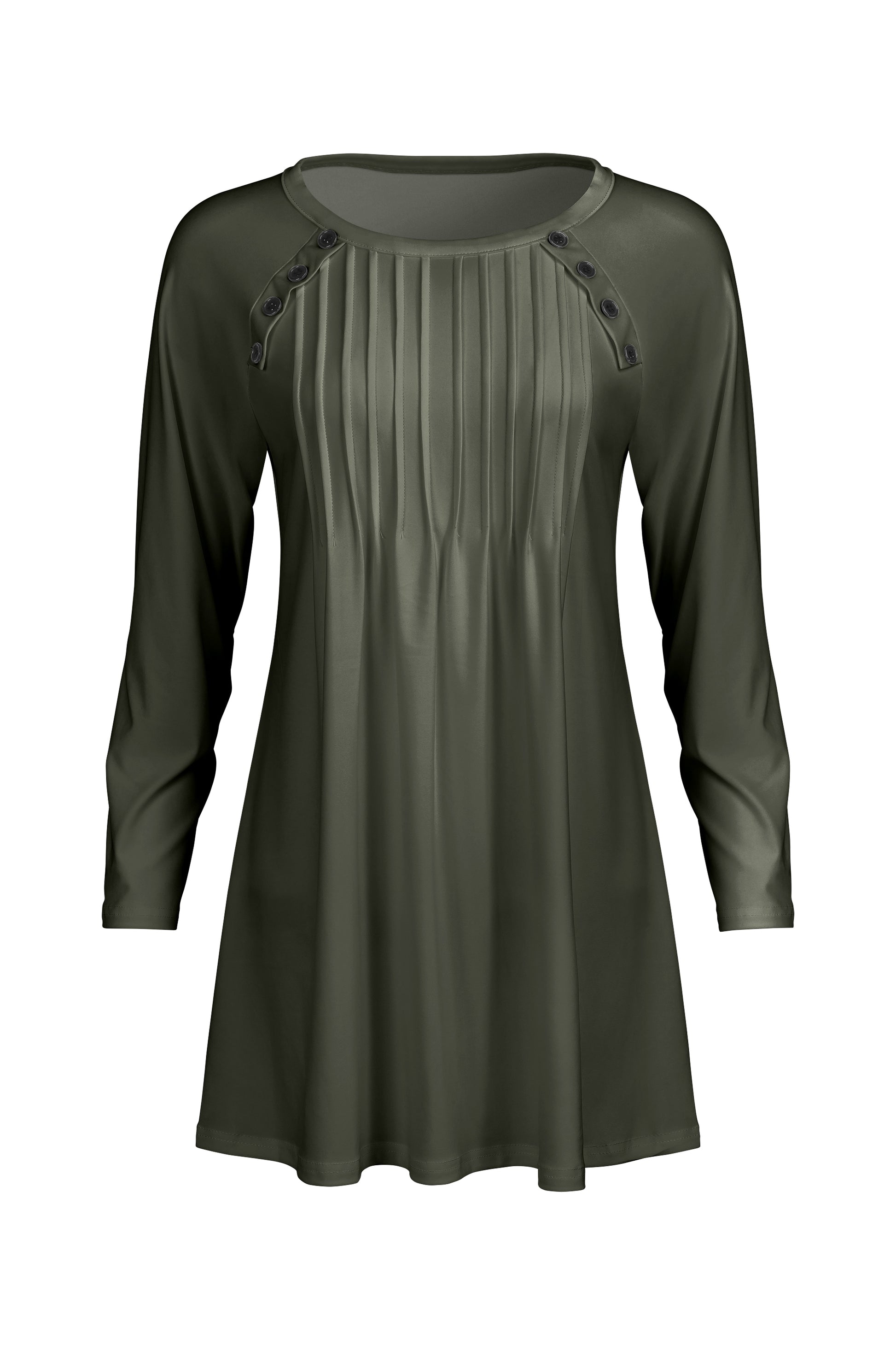 A graceful and feminine tunic featuring soft pleats on the front and three decorative buttons on each shoulder, adding subtle charm and structure. Made from a comfortable knit blend of 95% polyester and 5% spandex, it offers a flowy bottom hem for ease and movement. Perfect to pair with leggings for a flattering, effortless look.